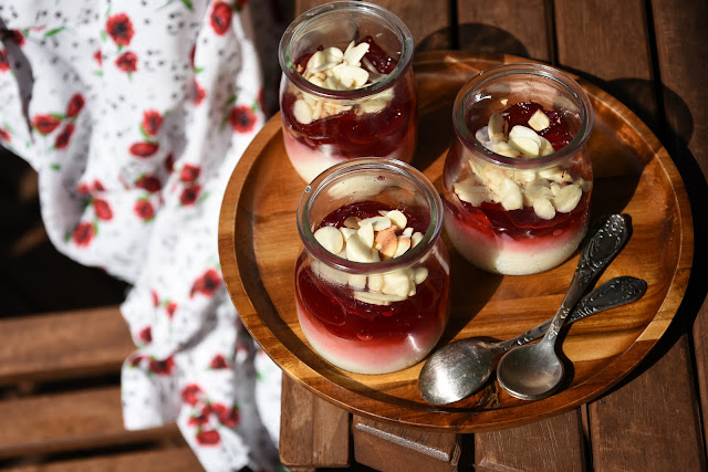 Składniki: 200g mleka migdałowego (może być kozie) lub wody, 2 łyżki stołowe grysiku orkiszowego, przyprawy: bertram, galgant, cynamon, sól bez antyzbrylaczy (wystarczy po jednej szczypcie), 6 łyżek malinowej galaretki, prażone płatki migdałów.