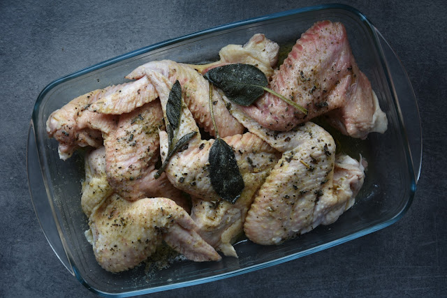 Składniki: pół kostki masła, 1 łyżeczka suszonej szałwii, pół łyżeczki sproszkowanego hyzopu, 1 łyżeczka soli kamiennej bez antyzbrylaczy, 6-8 skrzydełek, kilka listków świeżej szałwii.